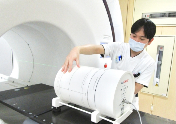 近年、放射線治療は装置や技術の向上により大幅に進歩しています。それに伴い装置や技術は複雑化しており、精度管理項目も多岐にわたります。当院では、医学物理士/放射線治療品質管理士が中心となり、それぞれの点検項目について必要な頻度(毎日・週1回・年1回など)を定めて、計画的に品質管理を行っています。