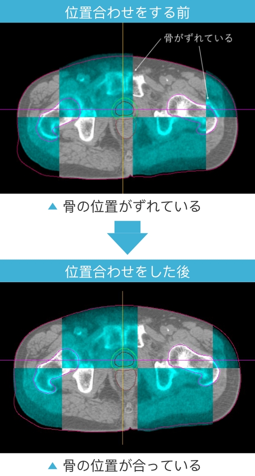 毎日の治療では、治療計画時の体位(腕の上げ方や体の向き)を再現するために、体表面に書かれた印を使用して体位を調整しています。しかし、治療するがんの部分は体の外部から正確な位置を確認することが困難です。そのため、照射の直前や照射中に得られるX線画像・CT画像を参考に寝台の位置をmm単位で動かして正確な位置合わせを行います。この技術を画像誘導放射線治療(Image-guided radiotherapy:IGRT)と言います。治療計画時には、目的の腫瘍から放射線が外れないように、腫瘍の大きさよりも少し大きめ(余白・マージン)に放射線を当てるように設定します。正確な位置合わせをすることで、このマージンをより小さくし、周囲の正常組織に対する影響を減らすことができます。